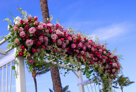 Mẫu cổng hoa cưới C-15: Rất đơn giản nhưng gây ấn tượng cực kỳ mạnh bới những đóa hồng thơm mát được kết lại với nhau như một khu vườn nhỏ xinh. Tông màu hồng nổi bật phía trên vòm cổng, hai bên là những chiếc lá dừa được tạo hình tỉ mỉ khiến ai cũng phải xuýt xoa.