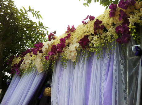 Mẫu cổng hoa cưới C-06: Ngoài một cổng hoa, bạn còn có thêm bốn cọc hoa nhỏ trang trí hai bên như dẫn lối quan khách cùng cô dâu chú rể đi vào lễ đường. Tông màu trắng tinh khiết của những dải lụa và riuy bằng trắng. Những đóa hoa hồng trắng, lan trắng điểm với sắc hoa tím đem lại sự nổi bật cho cổng hoa. Những nhành hoa lan rủ xuống trên vòm cổng tạo một cảm giác vô cùng lãng mạn.