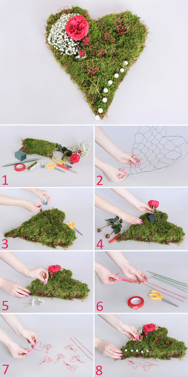Kiểu cắm hoa khá độc đáo về ý tưởng, nguyên liệu cần có đó là 1 cành hoa hồng, tùy màu sắc bạn yêu thích nhưng không nên chọn hoa hồng trắng, vì nó có thể sẽ phá vỡ ý tưởng, không làm nổi bật ý tưởng cắm hoa. Miếng xốp cắm hoa, màng rêu xanh, kẽm, hạt cường trắng, sáp hồng, ghim, dao, kéo. Tiến hành cắm hoa, đầu tiên bạn cần cắt kẽm thành 1 đoạn sau đó uốn cong tạo để tạo thành hình trái tim, rỗi dùng chính sợi thép đó đan thành hình những mắt lưới ghép vào với nhau và buộc cố định chúng lại với nhau. Rồi phủ lên đó một mảng rêu xanh, phủ đều trên khung hình trái tim và cũng buộc cố định chúng lại với nhau.  Để cho khung hình thêm chặt hơn thì bạn hãy dùng ghim để ghim chúng vòa bên trái của trái tim, rồi tiến hành nhanh chóng gắp miếng xốp đã chuẩn bị trước đó vào. Như vậy là bạn đã có khối hình trái tim với màu cỏ xanh mượt, bây giờ bạn chỉ cần cắt cành hoa hồng và sát mặt xốp và những cành hoa trang trí xung quanh, hoa baby. Tiếp tục đính kèm lên đó những hạt cườm trắng lên trên mặt trái tim, và quấn sáp hồng bên ngoài sợi kẽm, uốn cong tạo hình cặp đôi trái tim và gắn vào mặt trái của hình trái tim là xong. Kiểu cắm này có phần cầu kì nhưng hiệu quả mà chung mang lại cho không gian của chúng ta thì hoàn toàn xứng đáng bạn nhé.   Tạo hàng rào gỗ trái tim với hoa đồng tiền