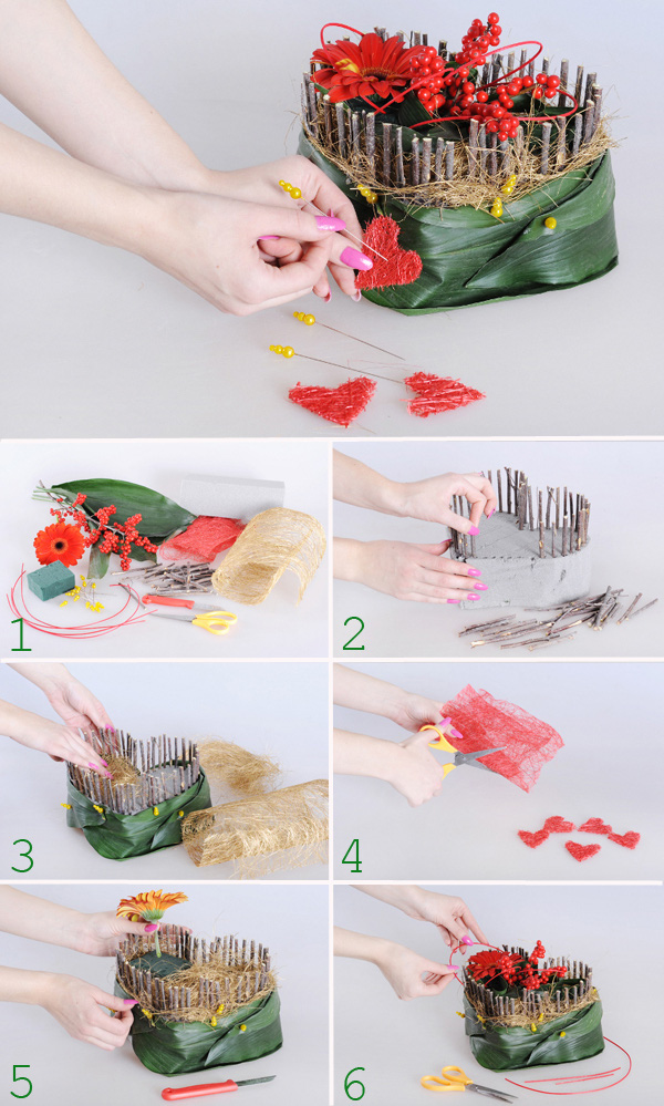Nguyên liệu cần có đó là: Hoa đồng tiền đỏ, lá cắm hoa loại lá to bản, xốp cắm hoa, giấy xơ dừa màu đỏ, vàng, cành cây khô, kim ghim hồ lô, kẽm màu đỏ, dao, kéo.  Để có lẵng hoa hình trái tim độc đáo này thì bạn cần cắt xốp thành hình trái tim tương tự như những cách làm trên. Cắt các cành cây khô thành nhiều đoạn ngắn, có chiều dài cao hơn hình trái tim 1 chút xíu. Sau đó bạn hãy cắm viền xung quanh trên bề mặt trái tim rồi dùng giấy xưa dừa vừa chuẩn bị phủ kín lên trên. Để không bị thô thì bạn hãy quấn xung quanh hình trái tim bằng những chiếc lá màu xanh to bản trên rồi dùm ghim cố định lại. Bây giờ côn việc còn lại là bạn chỉ cần cắm hoa vào bên trong hình trái tim này là được, khi căm bạn cũng nên chọn bố cục cho hoa sao cho có sự cân đối với tổng hình khối và những bông hoa nhỏ đi kèm khác.  |