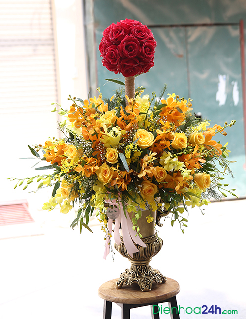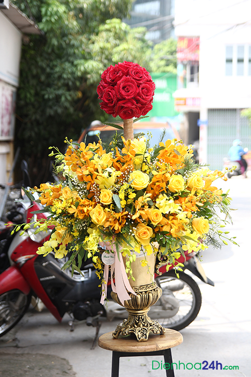 Bình hoa được sử dụng hoa hồng đỏ, hoa lan mokara, hoa hồng vàng..