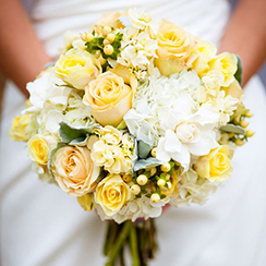 Lựa chọn tiếp theo dành cho bạn đó là hoa cẩm tú cầu trắng được đan xen cùng những cánh hoa hồng vàng, tạo sự khác biệt vượt trội trong sự sáng tạo cũng như thể hiện con mắt thẩm mỹ tinh tế của cô dâu.