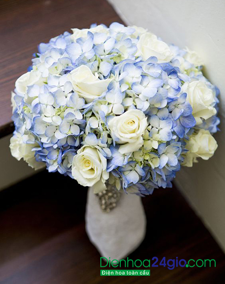 Hay bó hoa cưới cầm tay kết hợp giữa hoa hồng bạch và hoa cẩm tú cầu xanh dương cũng là sự lựa chọn hoàn hảo đến không ngờ dành cho bạn. Nhất là khi bạn kết hợp chúng cùng với lối trang điểm hiện đại, bộ váy trắng đuôi dài hoặc xòe rộng đều hợp.