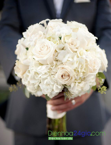 Để giảm bớt đi sự nhàm chán thì bạn cí thể sử dụng bó hoa hồng trắng kết hợp cùng với hoa cẩm tú cầu trắng với 1 chút xíu hoa baby. Đó là sự kết hợp hoàn hảo đến không ngờ vừa tinh tế lại vừa hiện đại.