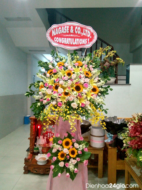 Tặng hoa khai trương làm từ những bông hoa hướng dương có thiết kế cách điệu. Giúp cửa hàng hoặc công ty khai trương nhìn nổi bật và sang trọng trong mắt quan khách có mặt trong sự kiện.