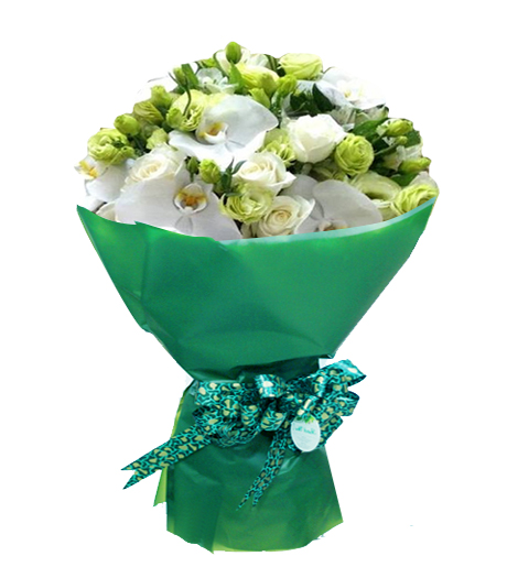 Bó hoa sinh nhật với gam màu xanh tinh tế được thiết kế tỉ mỉ từ từng cành hoa cẩm chướng pha trộn cùng hoa lan hồ điệp sắc trắng. Tạo nên món quà sinh nhật sang trọng, thể hiện được uy quyền và địa vị của người nhận.