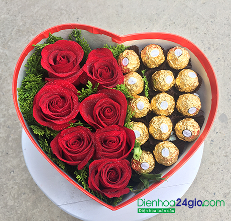 Hộp quà hoa tươi được trang trí từ 7 bông hoa hồng đỏ và 14 thỏi socola ngọt ngào với lời gửi gắm truyền tải thông điệp rằng bạn đang thầm thương trộm nhớ ai đó. Món quà này cũng là cách để bạn thể hiện nỗi nhớ dành cho những người thân ở xa.