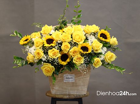 Giỏ hoa sinh nhật được trang trí từ hoa hồng và hoa hướng dương với sắc vàng rực rỡ. Mang đến cho mọi người món quà sinh nhật vừa tinh tế vừa nổi bật khi trưng bày trong từng sự kiện chúc mừng.