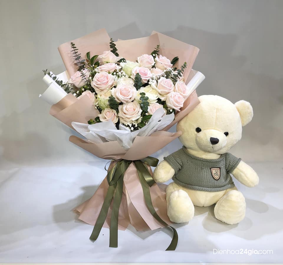 Bó hoa sắc trắng hồng và gấu bông