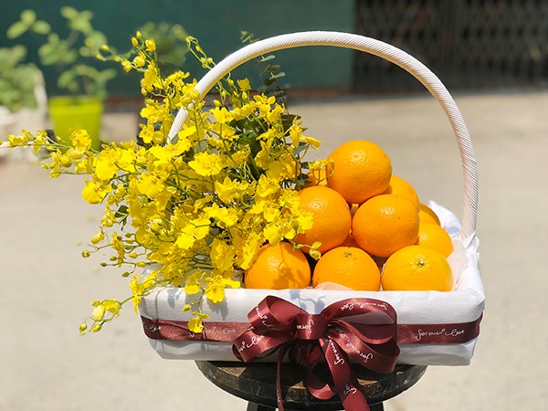 Giỏ cam tươi sắc vàng kèm với lan vũ nữ vàng nổi bật chính là sự lựa chọn hài hòa trong giỏ quà. Hoa lan vũ nữ mang lại vẻ đẹp đơn giản, tinh tế khi đi kèm với cam tươi giúp bạn thay lời bày tỏ tình cảm.