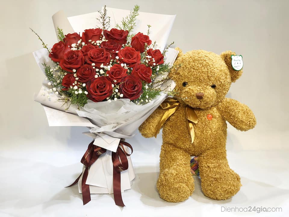 Tặng người yêu hoa hồng và gấu bông thay lời yêu thương