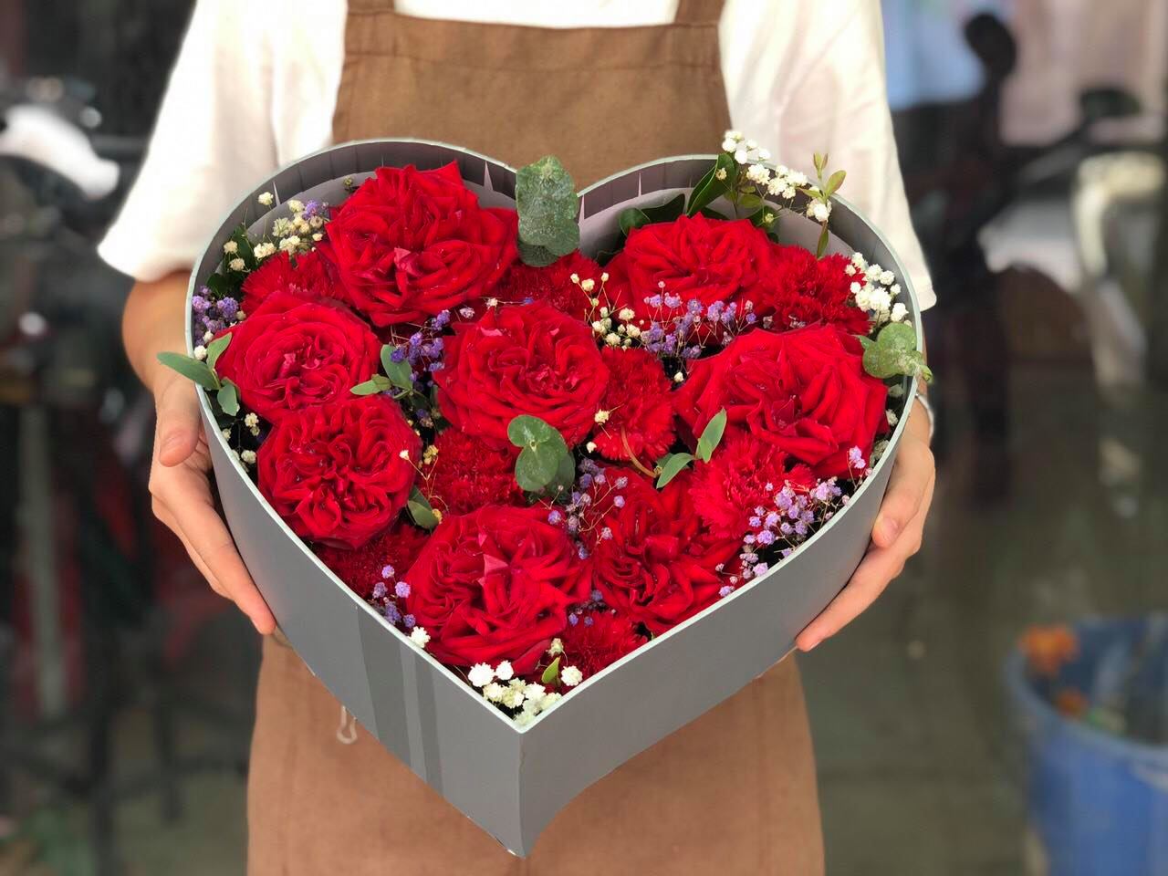 Các mẫu hoa tươi với đủ kích thước từ hoa ngoại nhập cho đến hoa trong nước, dễ dàng trang trí trong hộp quà hình trái tim.