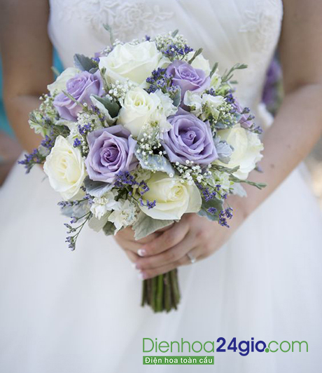 Hoa được bó theo dạng tròn, bên ngoài là vòng lá màu xanh sẽ tạo điểm nhấn hoàn hảo cho bó hoa. Không gian tổ chức tiệc cưới lãng mạn cùng chiếc váy màu trắng hoặc tím pastel sẽ khiến vẻ đẹp của cô dâu trở nên thật hoàn hảo.
