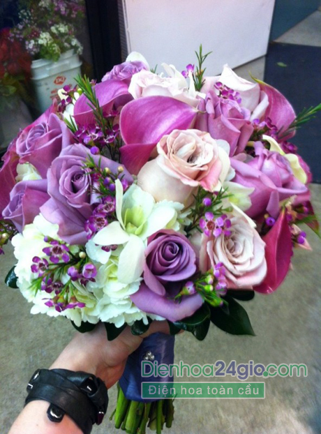 Hoa cưới cầm tay cát tường ánh tím là sự kết hợp của nhiều loại hoa như hoa lan, cẩm tú cầu, salem,… bất cứ loại hoa nào mà cô dâu cảm thấy thchs. Nếu bạn không thích màu tím thì có thể thay bằng màu khác cũng là sự thay thế hoàn hảo.