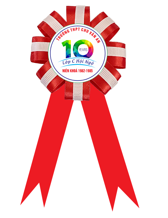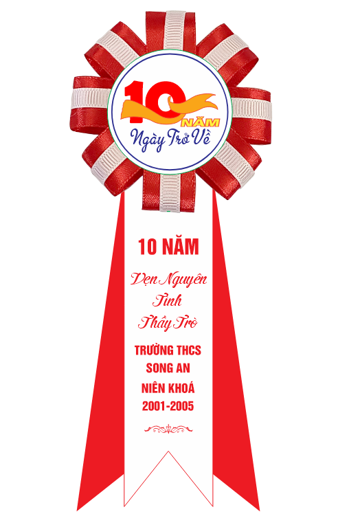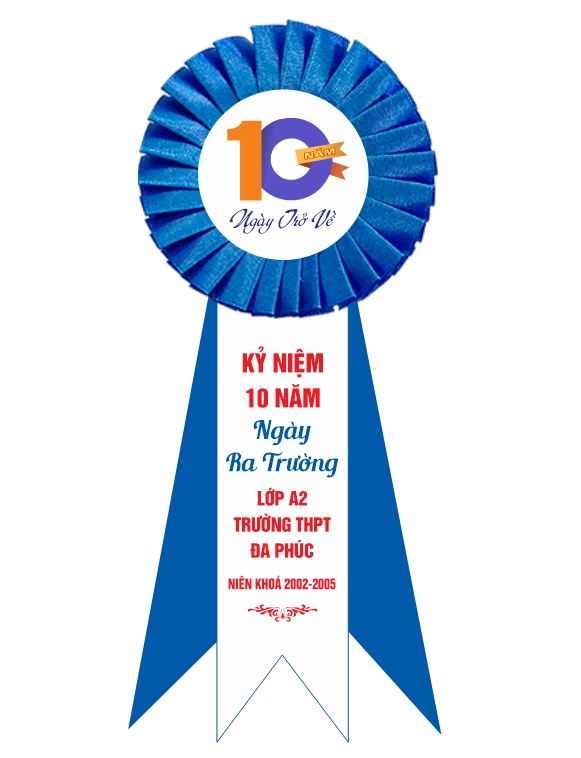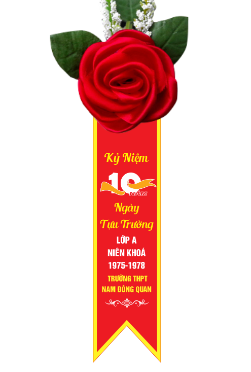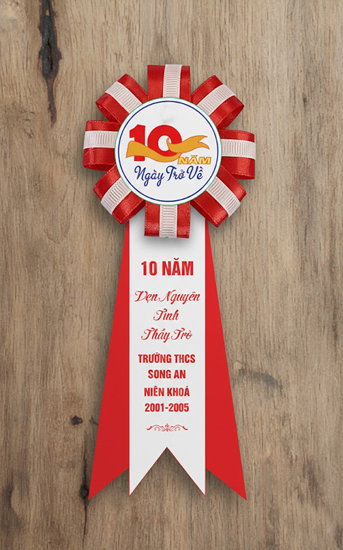 • Hoa cài áo kỷ niệm 10 năm ngày ra trường in logo lớp, tên trường, năm học.