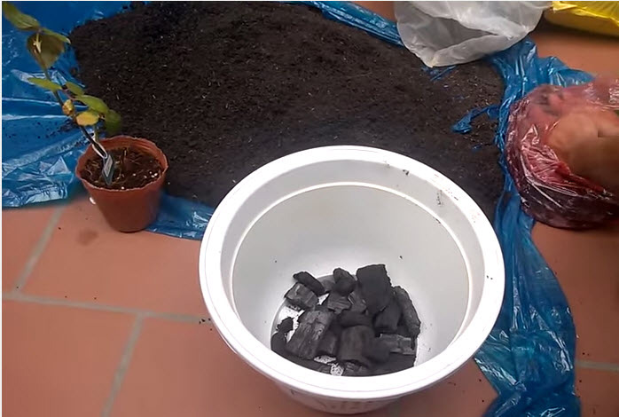 - Cho một lớp than hoa rồi đến xơ dừa to ở dưới đáy chậu. Lớp này giúp tạo độ thoáng làm thoát nước nhanh khi tưới, nhưng lớp xơ dừa giữ nước ở đáy chậu giúp cây vượt qua mùa hè nắng nóng.