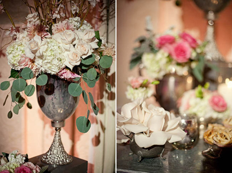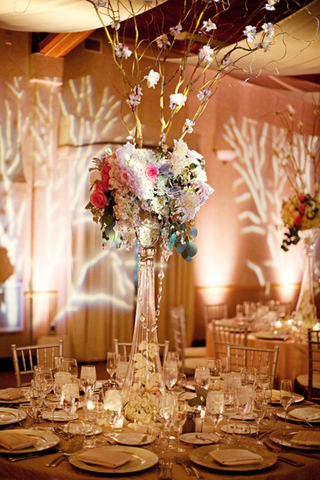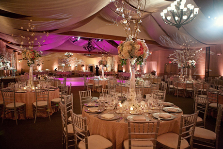 Không gian tiệc với những chiếc bàn tròn, bình hoa, hoa tươi cao lộng lẫy.