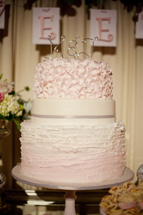 Bánh cưới với hoa văn bèo nhún mềm mại làm điểm nhấn cho bàn tiệc ngọt.