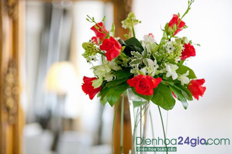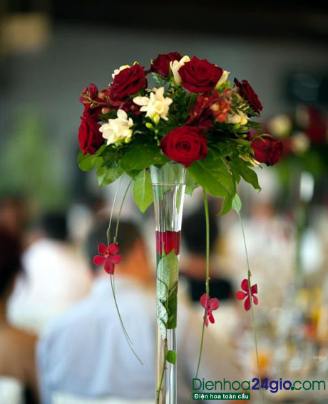 |  Với thiết kế đa dạng và độc đáo nhưng phổ biến nhất thường là hai kiểu dáng hoa bàn tiệc thấp và cao. Tùy theo từng phong cách và sở  thích của cô dâu chú rể hay không gian tổ chức buổi lễ bạn cần chọn kiểu hoa tươi phù hợp nhất. Nhưng dùng kiểu hoa nào thì bạn đừng quên tạo điểm nhấn và kết hợp với phụ kiện nổi bật nhé ! Sau đây chúng ta cùng đi tìm hiểu hai mẫu trang trí hoa bàn tiệc tuyệ đẹp này nhé ! Bình hoa thấp cho bàn tiệc nổi bật Không cầu kỳ hoành tráng, những bình hoa nhỏ xinh lại mang đến cho tiệc cưới không gian dễ thương, đáng yêu. Hoa bàn tiệc thấp cũng cần màu sắc nổi bật để gây ấn tượng với khách mời và mỗi bình hoa không bị “chìm nghỉm” giữa cổng hoa lộng lẫy hay ánh đèn lung linh. Uyên ương cũng có thể kết hợp thêm ánh nến hay các phụ kiện cưới độc đáo để cụm hoa trang trí trên bàn tiệc càng bắt mắt. .jpg)