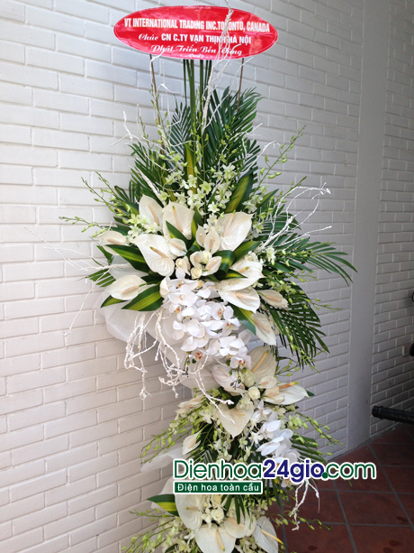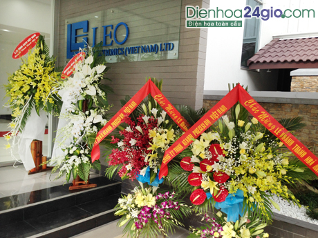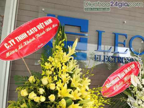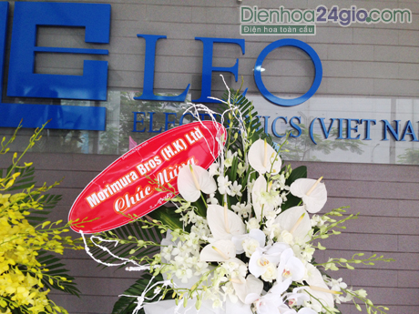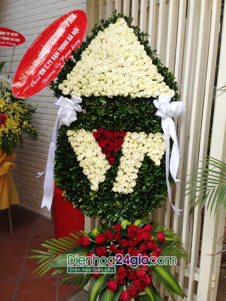 Bạn hãy so sách hai sản phẩm dưới đây. Sản phẩm của điện hoa 24 gio cắm gọn gàng với băng chữ rõ ràng. Một lãng bên cạnh cắm thưa  hoa hơn nhiều và băng chữ không chuyển tải rõ ràng nội dung chúc mừng. Điện hoa 24gio dùng băng chữ in màu, Quý khách có thể in logo và các tông màu theo logo của Quý vị .JPG)
