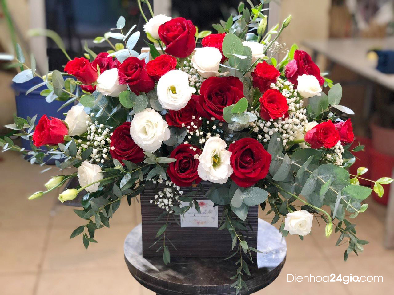 Ngoài các mẫu hoa tươi thiết kế thành bó, lẵng hoặc kệ hoa thì nhiều nơi sáng tạo thành mẫu hoa trong hộp. Với mẫu hoa này, bạn có thể chọn làm quà tặng sinh nhật, khai trương, các dịp đặc biệt,...