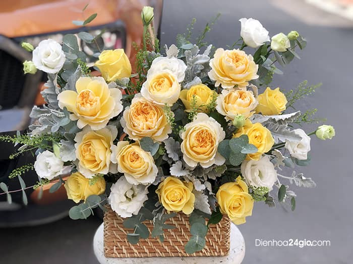 Sản phẩm gồm: Hoa hồng vàng, hoa lá phụ khác...