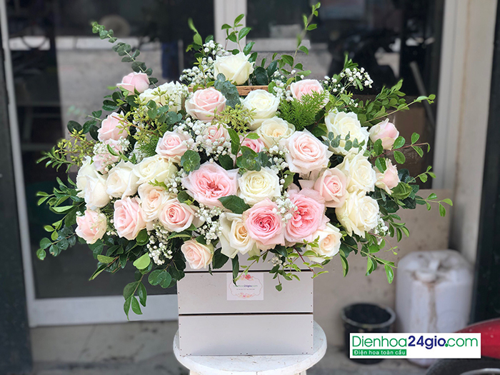 Sản phẩm gồm: hoa hồng trắng, kem, pink ohara, hoa phụ khác...